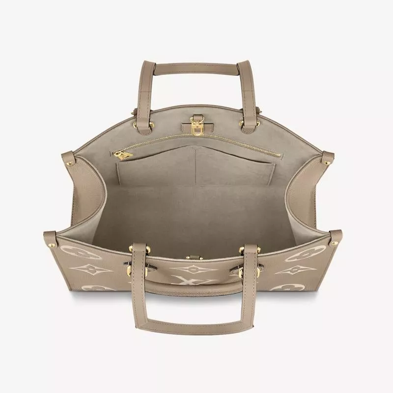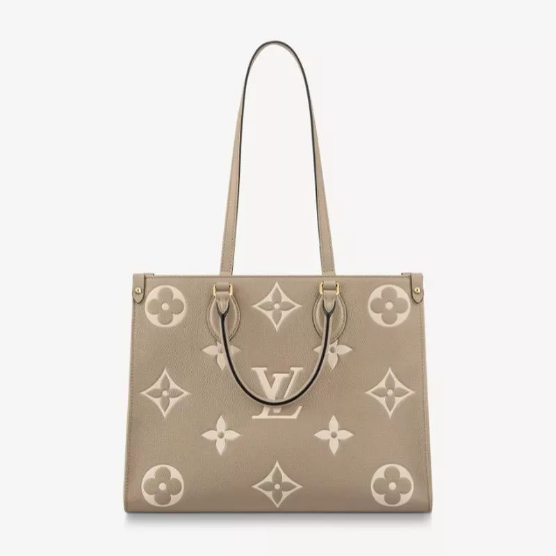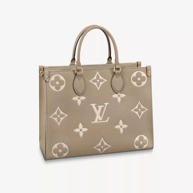 - 長短2種類のハンドルで、手持ちやショルダーバッグとしてもお楽しみいただけるミディアムサイズの「オンザゴー MM」。しなやかなグレインカーフレザーに、ミディアムサイズのモノグラム・パターンをプリントとエンボス加工であしらいました。収納力に優れ、ノートパソコンなどビジネスの必需品も持ち運べる汎用性の高さも魅力。日常使いに最適なバッグです。
