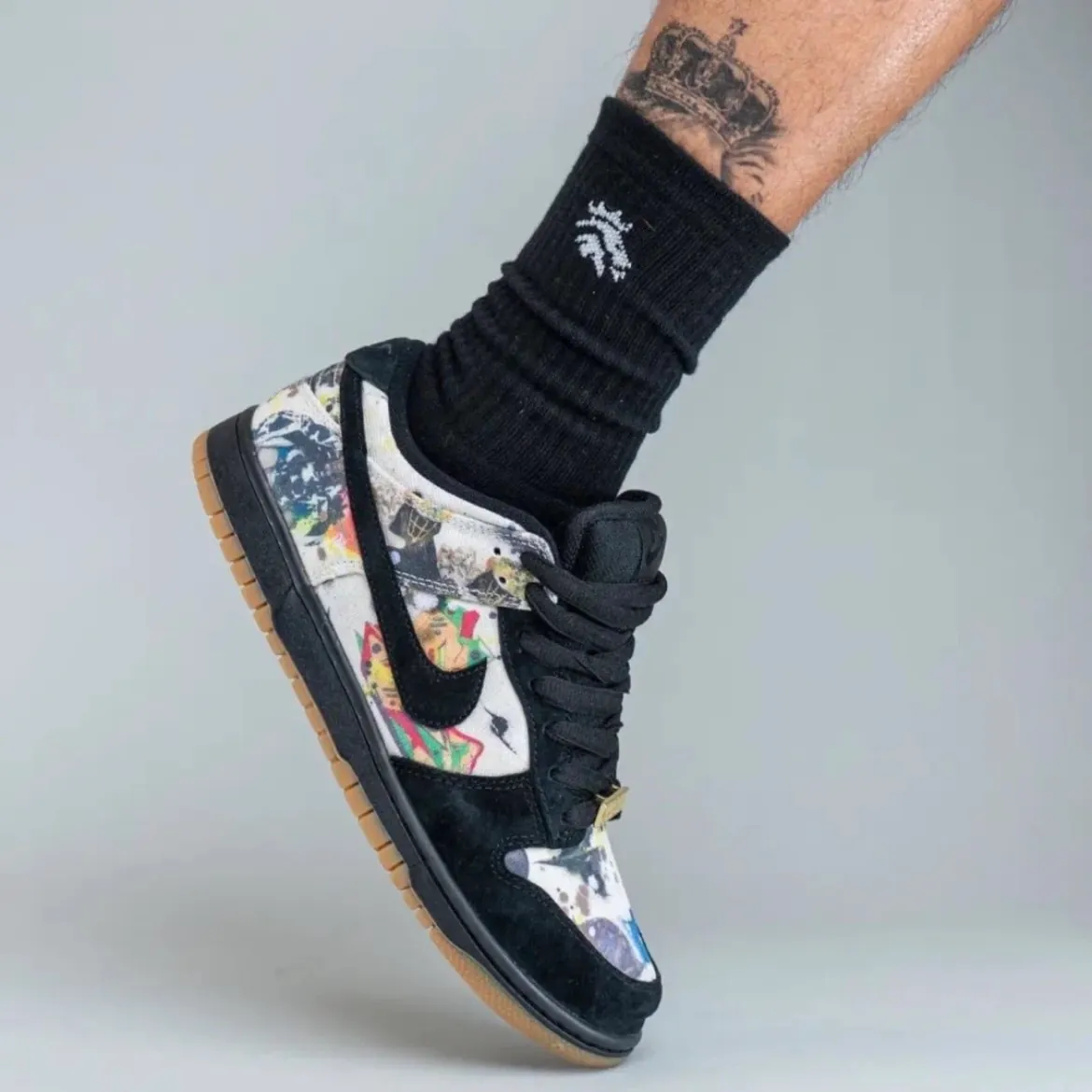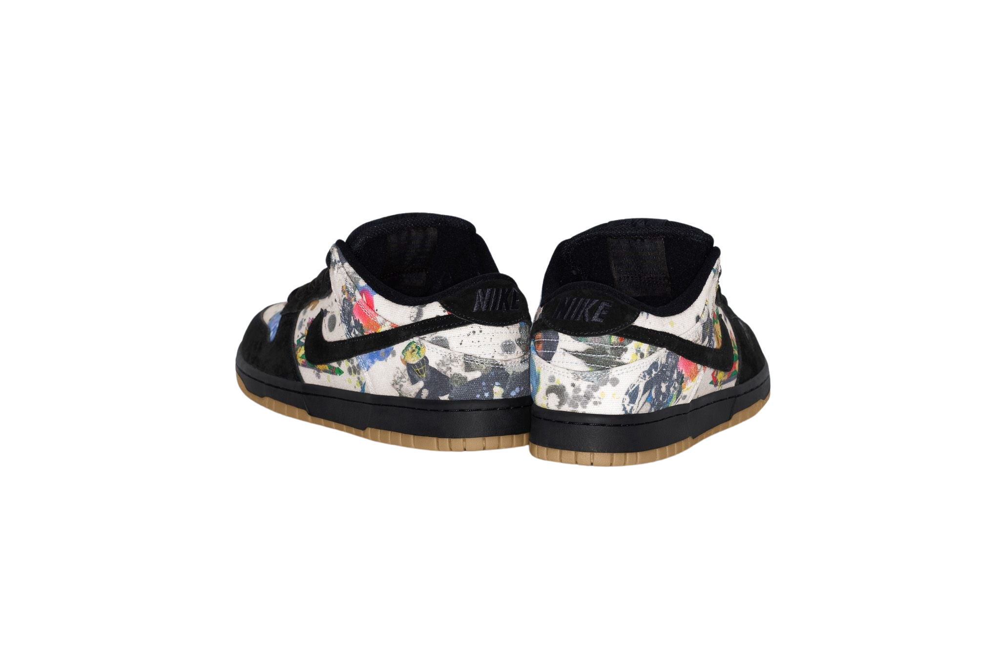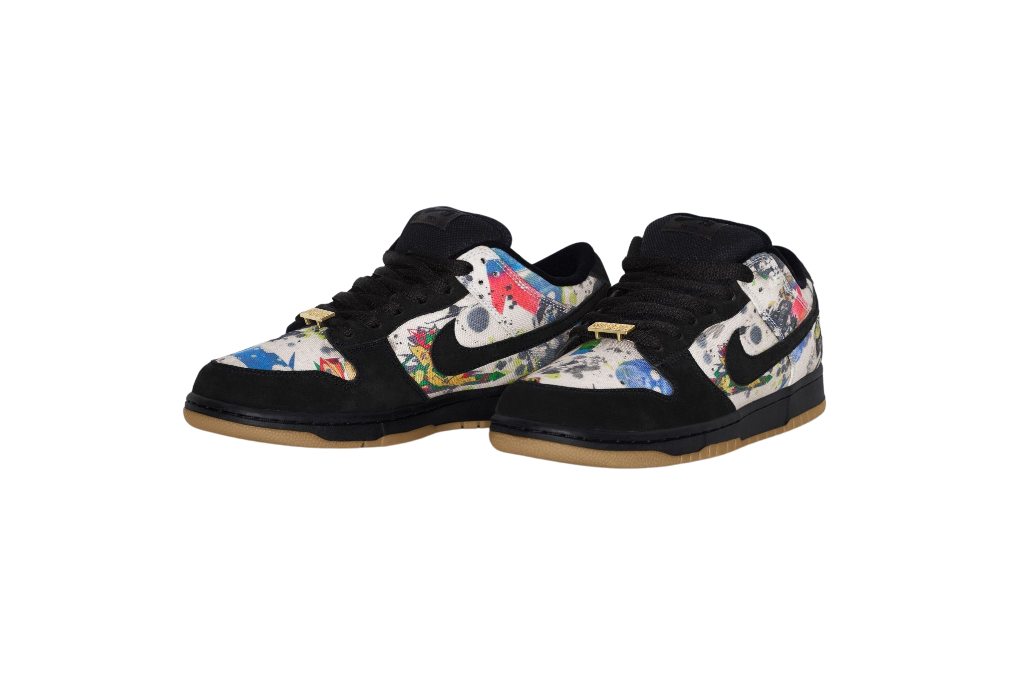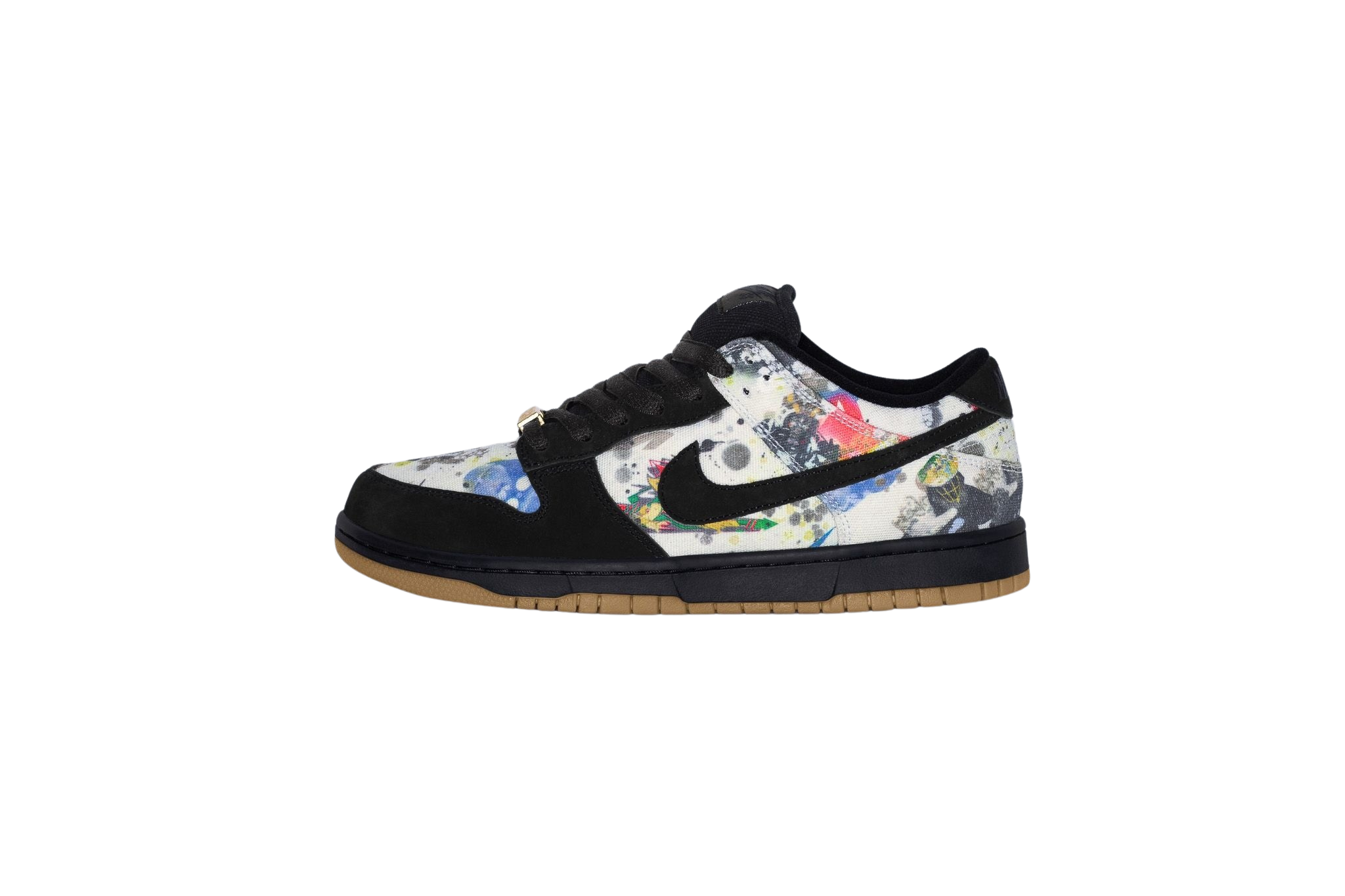 Suede and canvas upper with printed graphic. Rubber gum outsole with Zoom Air unit and in heel and padded mesh tongue. Co-branded footbed with mesh collar and tongue lining. Logo lace locks and embroidered logo on suede heel tab. Original artwork by Rammellzee. Made exclusively for Supreme.